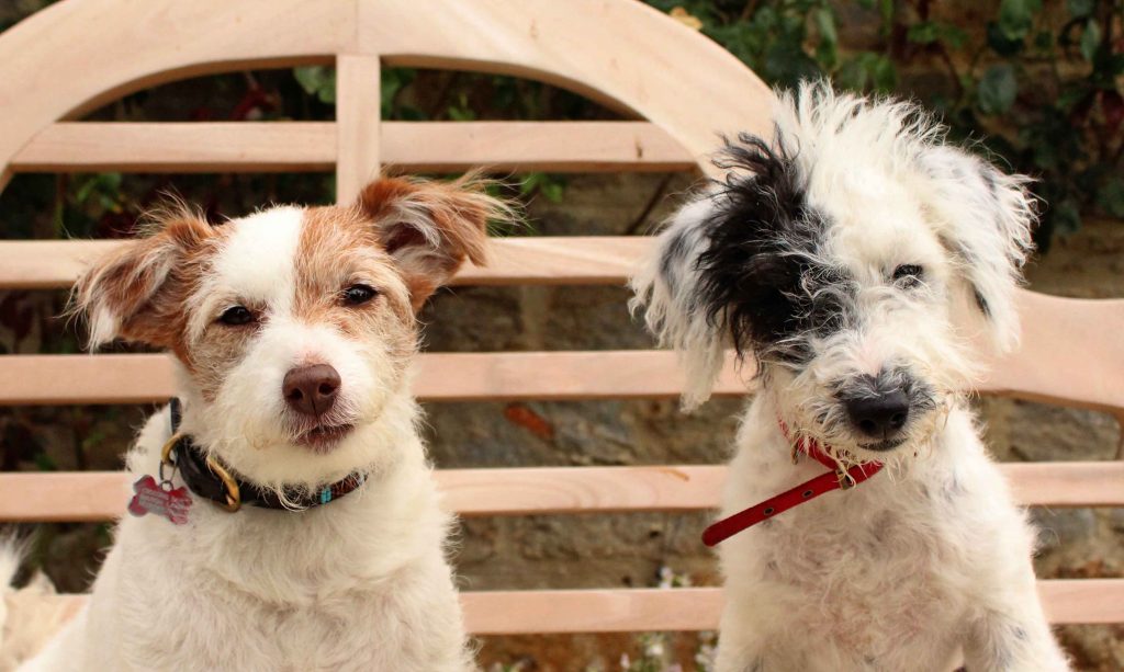 Madge is 10, her puppy Malcolm is 3. Impeccably behaved for a Jack Russell and a Jackapoo (or as impeccably behaved as these dogs could ever be).